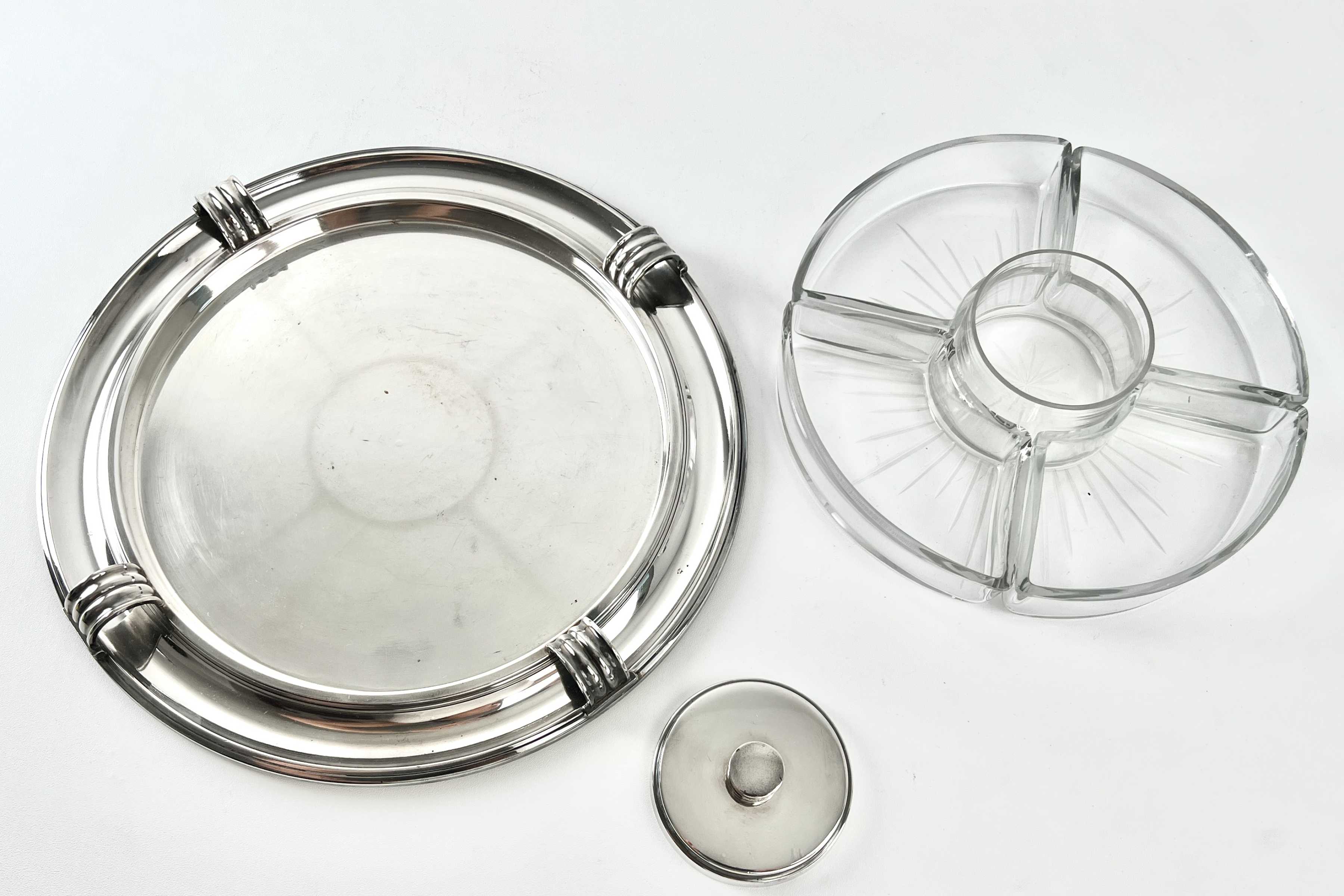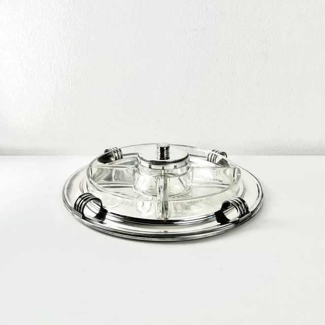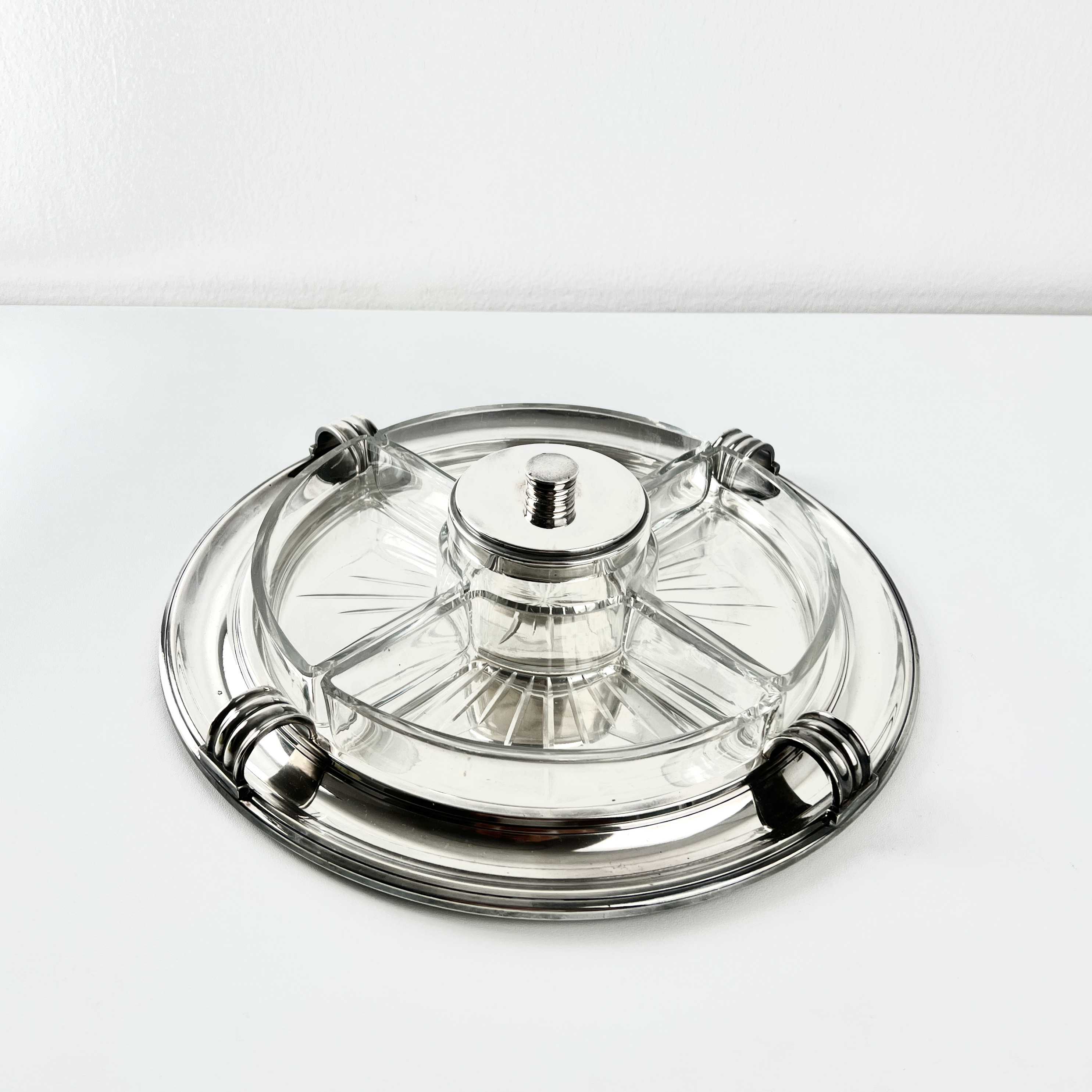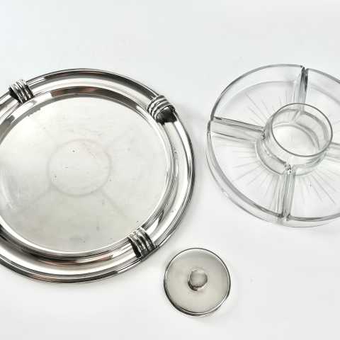 Art Deco, Design Luc Lanel, Vorspeisentablett mit 4 geschliffenen Glaseinsätzen am Rand + 1 runder Glas-Dipeinsatz mit Deckel