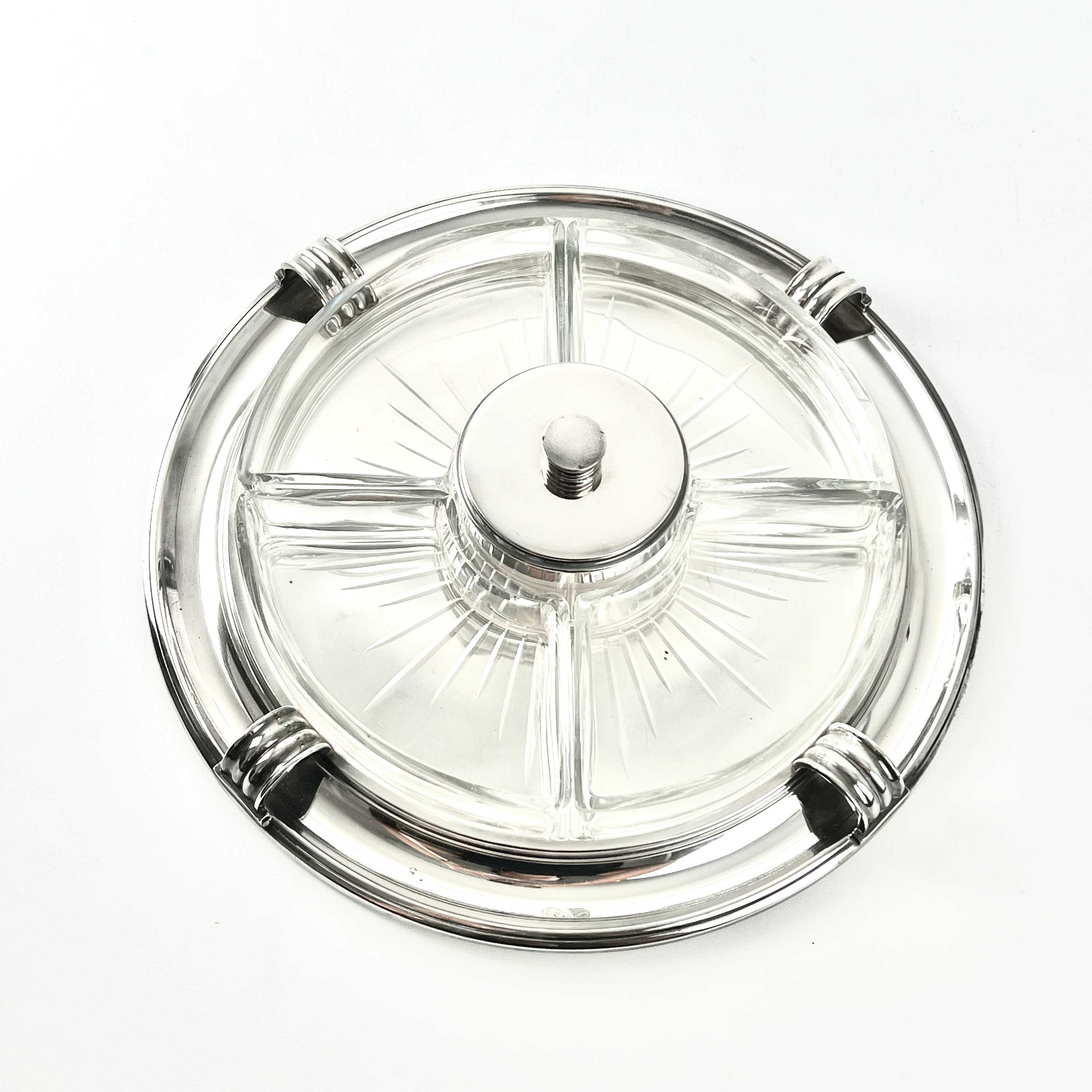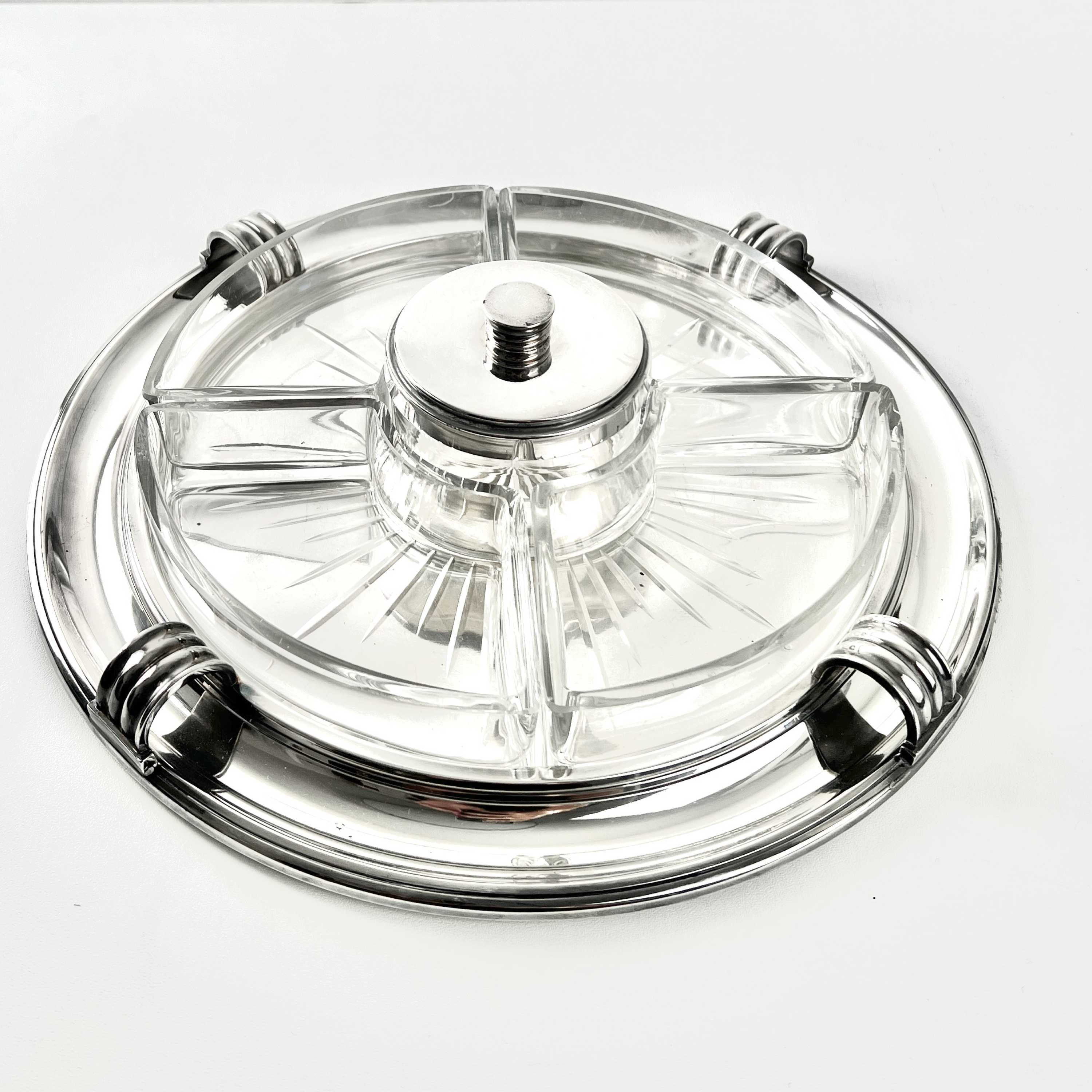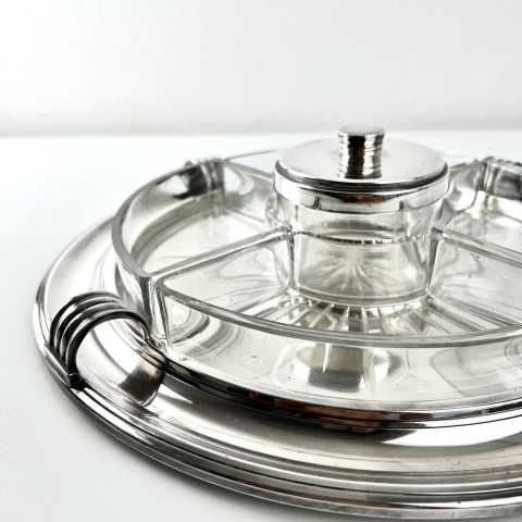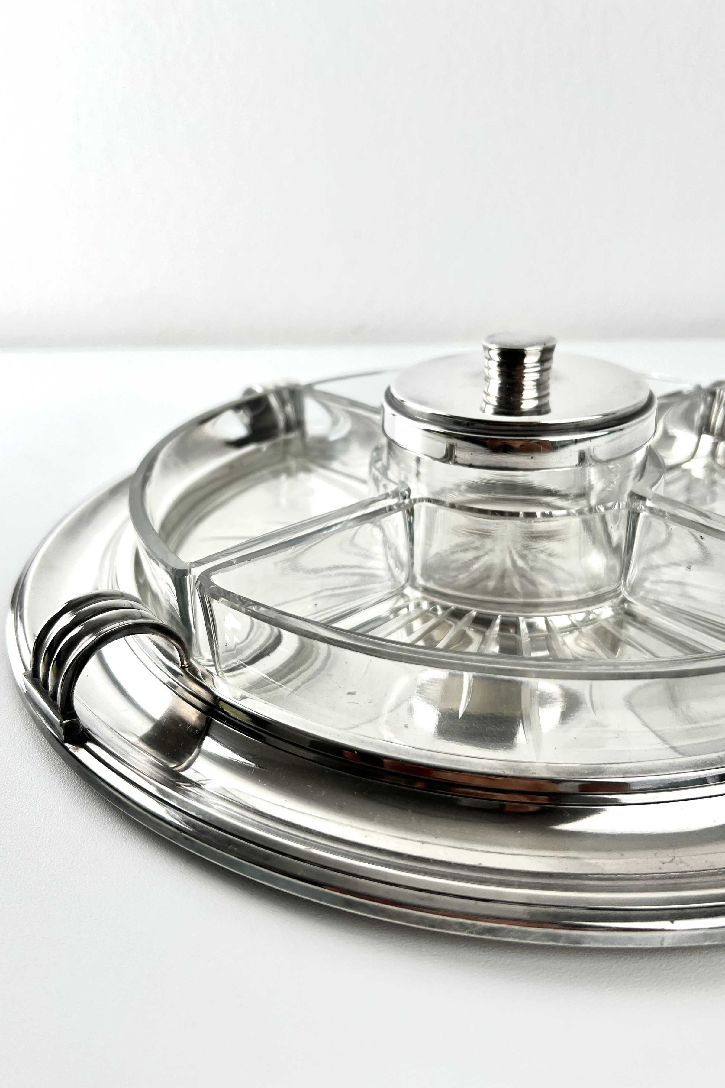 Art Deco, Design Luc Lanel, Vorspeisentablett mit 4 geschliffenen Glaseinsätzen am Rand + 1 runder Glas-Dipeinsatz mit Deckel